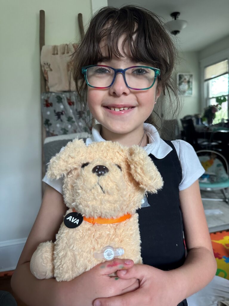 In the autumn of 2025, Gabriella’s doctors were confident enough in Gabriella’s ability to get her nutrition by mouth that they decided she could have her G tube removed. Gabriella is now doing well (and still loves Ava, her fluffy friend with the feeding tube).